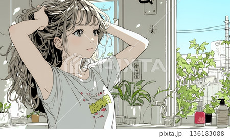 夏の南国の海辺を一人で旅行中の若い女性