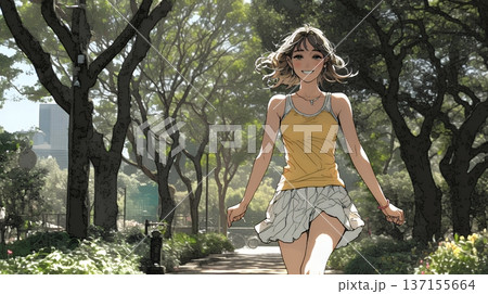夏空の下でソフトクリーム(コーンに乗ったアイスクリーム)をたべる若い女性