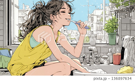 イラスト:思案・反省・諦め— 窓から流れ落ちる雨粒を見つめる若い女性 イラスト:思案・反省・諦め— 窓から流れ落ちる雨粒を見つめる若い女性